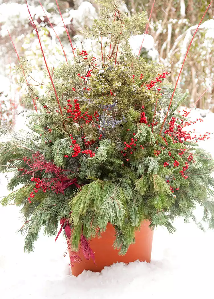 جعبههای پنجره، سبدهای آویز، گلدانهای مقاوم در برابر زمستان: همه برای محوطهسازی زمستانی ضروری هستند. صنوبر کوتوله آلبرتا و درختچههای پهن برگ همیشه سبز – مانند آندرومدای ژاپنی، هالی و رودودندرون – برای زمستان عالی هستند، اما همه آنها باید در دورههای خشک آبیاری شوند. اگر ترجیح میدهید از گیاهان زنده صرف نظر کنید، پیرسون توصیه میکند گلدانها را با شاخههای همیشه سبز با بافتها، رنگها و شاخههای مختلف پر کنید. او اضافه میکند: “هر چیزی که رنگی باشد”.
