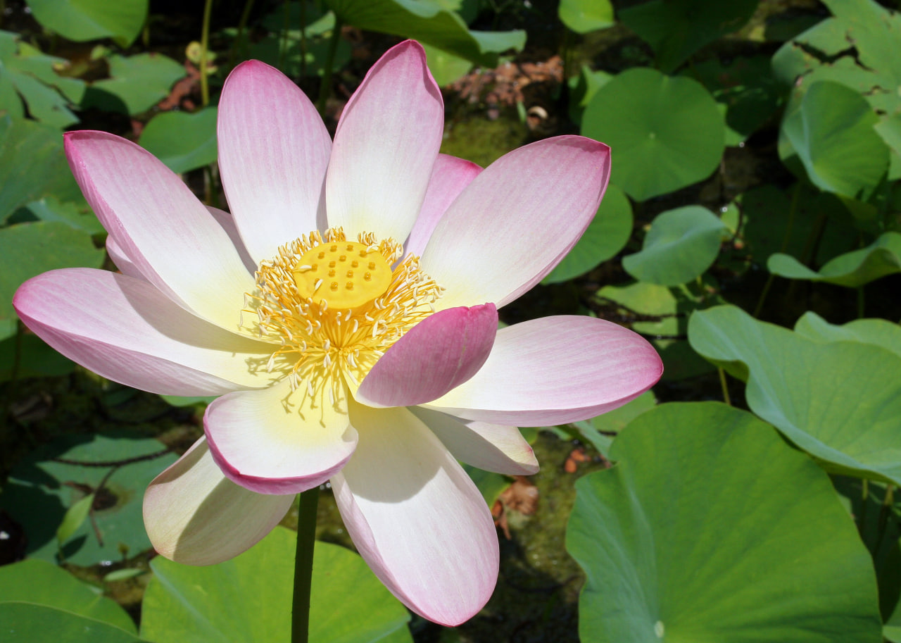 لوتوس با نام علمی (Nelumbo nucifera) گیاهی آبزی چندساله و نمادین از خانواده Nelumbonaceae است. این گونه بومی مناطق گرمسیری و معتدل گرم آسیا (از هند تا چین و ویتنام) است و در آبهای کمعمق، مردابها و دریاچهها رشد میکند. برخلاف گیاهان شناگر، برگهای بزرگ و چترمانند آن بهصورت شناور یا کاملاً بالاتر از سطح آب قرار میگیرند. این برگها به دلیل ساختار میکروسکوپی خاص (اثر لوتوس) دارای خاصیت خودتمیزشوندگی فوقالعادهای هستند. گلهای بزرگ، معطر و دیدنی آن که قطرشان به ۲۰ تا ۳۰ سانتیمتر میرسد، به رنگهای سفید، صورتی یا قرمز دیده میشوند و پس از گردهافشانی، میوهای مخروطی و اسفنجی بهنام «سبدنیشن» تولید میکنند.