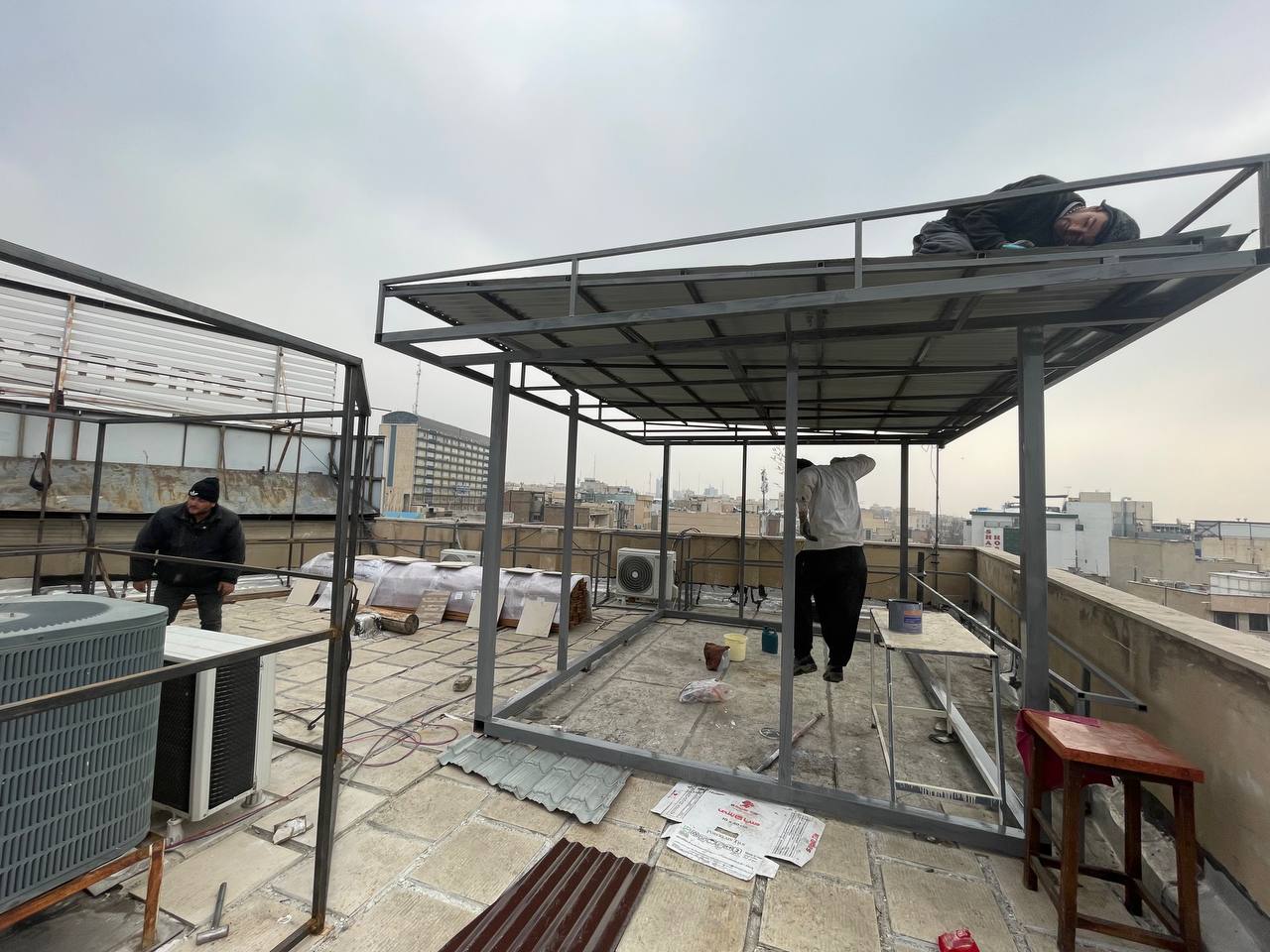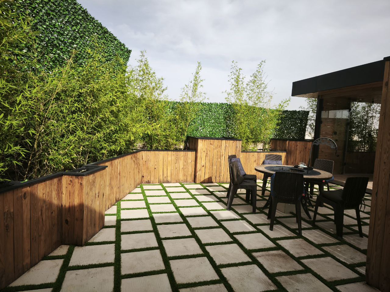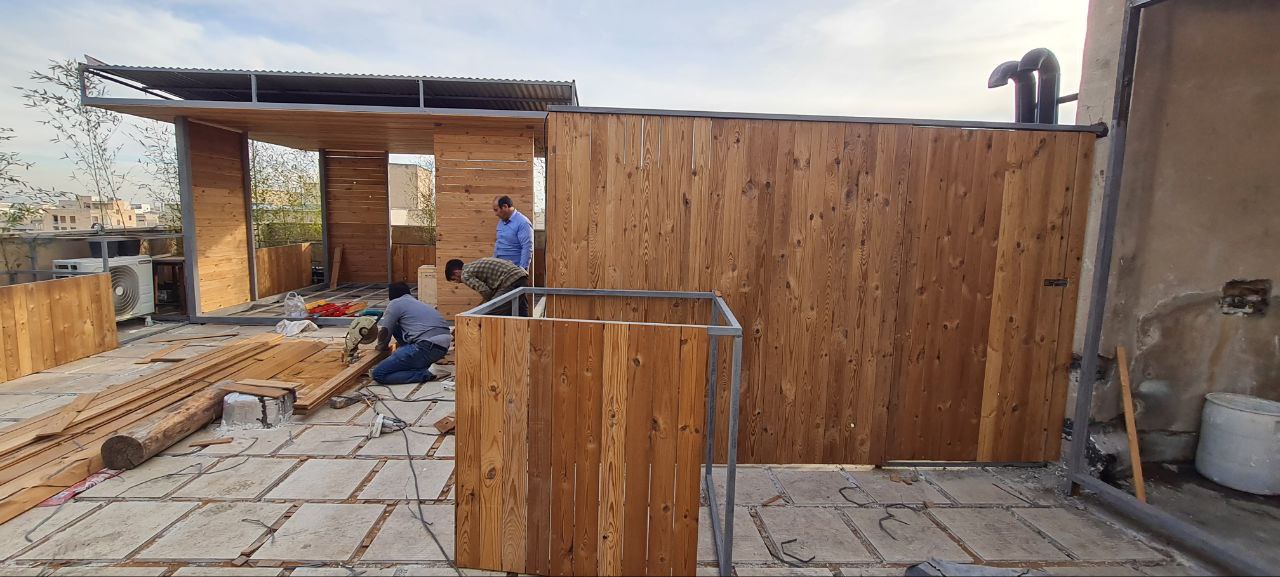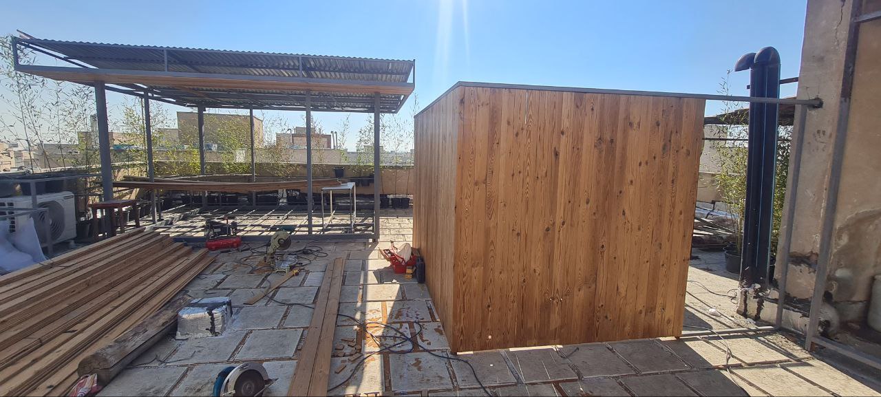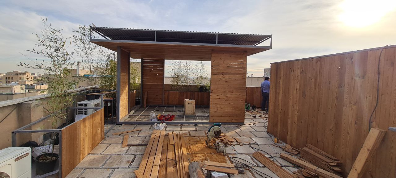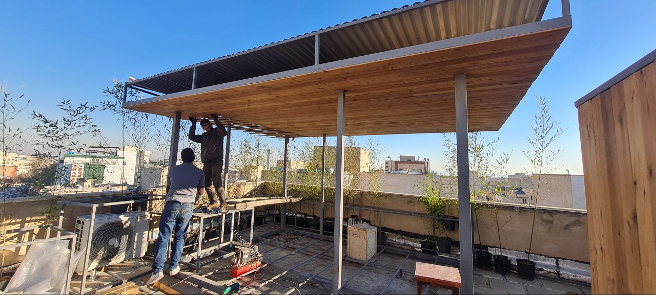 احداث روفگاردن در بامی به مساحت ۱۲۰ متر مربع، با هدف ایجاد فضایی سبز، مدرن و کارآمد در عین حفظ زیبایی و نظم شهری انجام شد. در بخش ابتدایی پروژه، یکی از چالشهای اصلی وجود کولرهای گازی و تأسیسات فنی بود که جلوه بصری فضا را تحتتأثیر قرار میداد. برای جداسازی این بخش از فضای اصلی، دیوارهای چوبی با طراحی هماهنگ با سبک مدرن بام اجرا شد تا هم تهویه کولرها مختل نشود و هم دید مستقیم به این بخش حذف گردد.